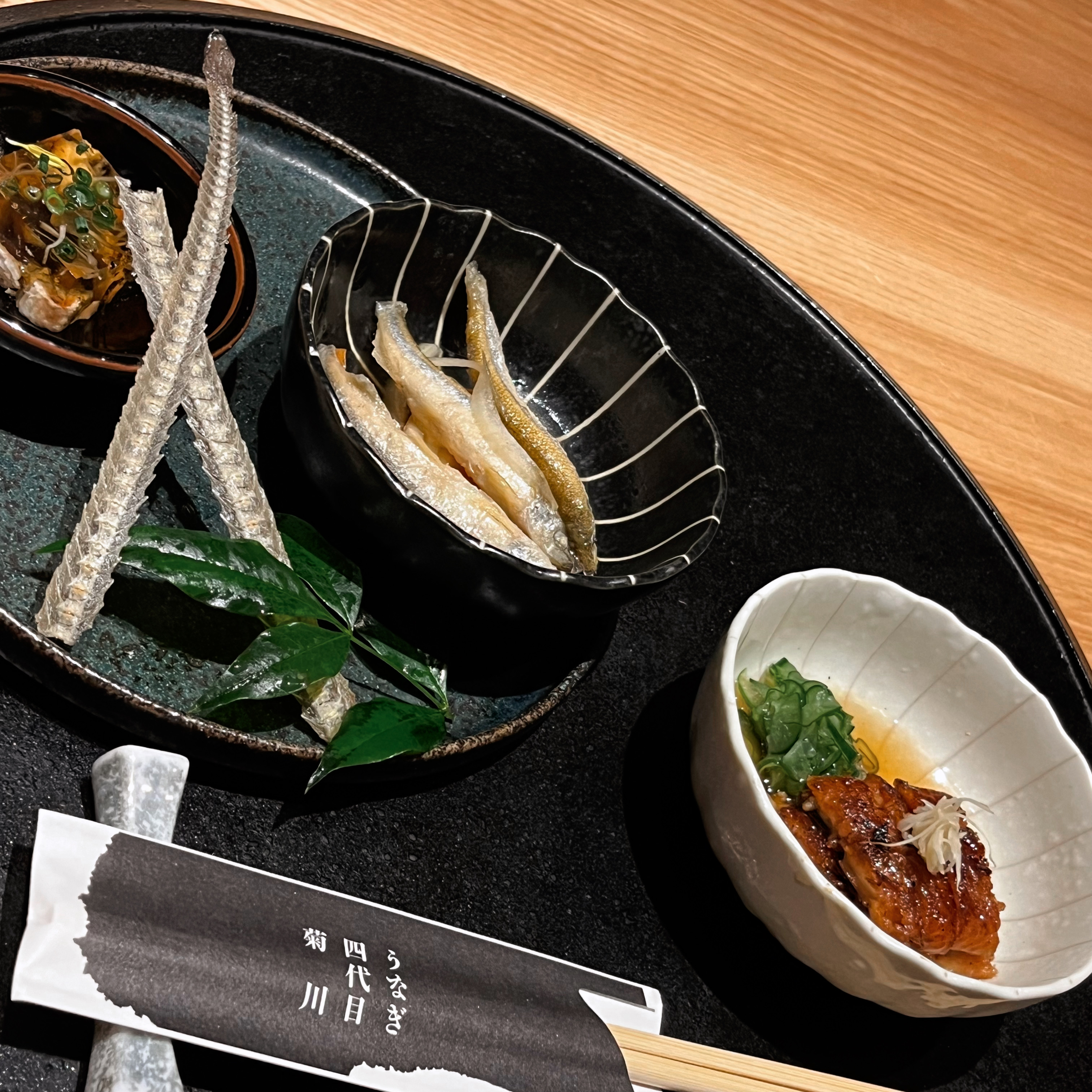 季節の三種のうなぎの骨せんべいがいい塩味で、うなぎの煮こごりが最高でした。タッパーで欲しい…。ワカサギも美味しかったです。