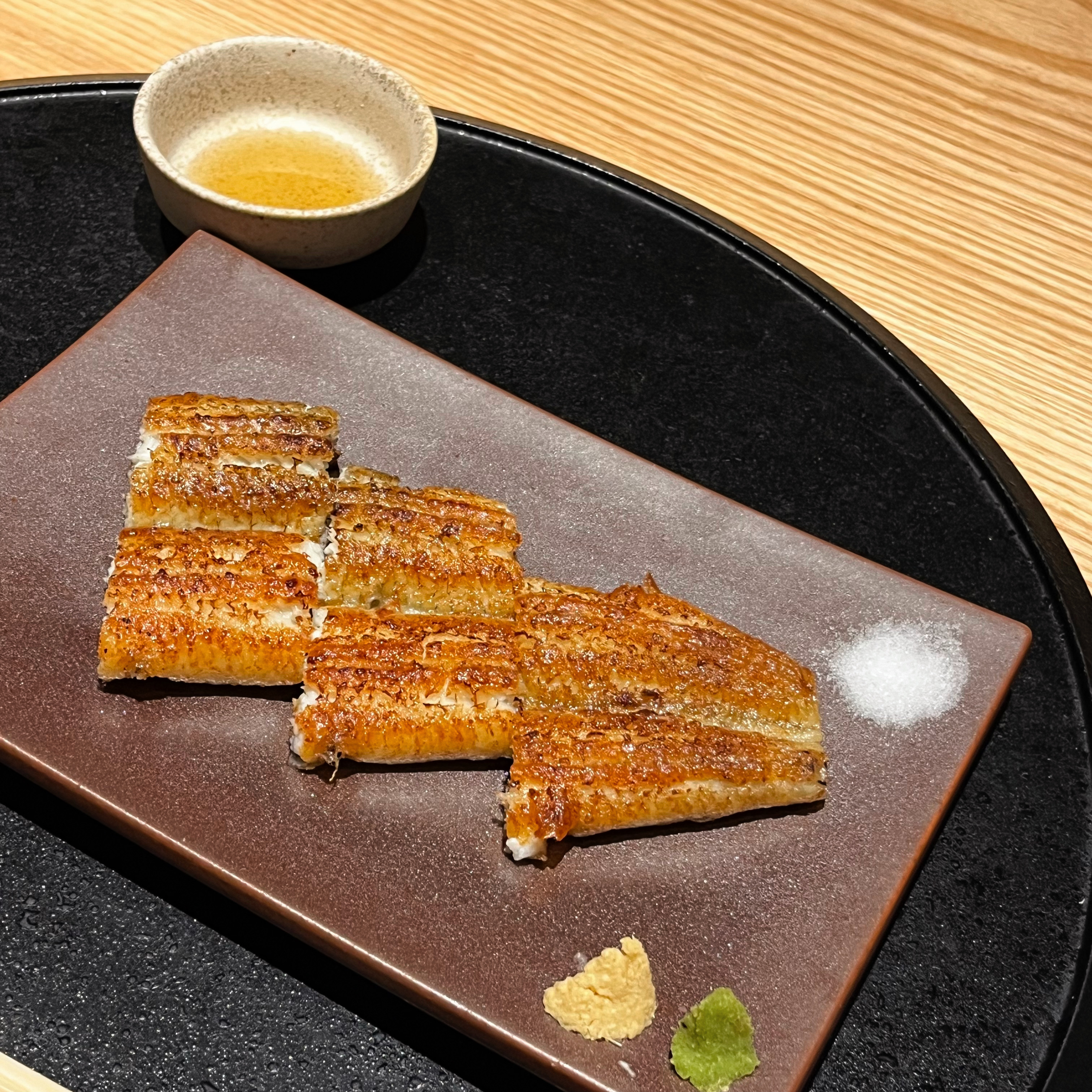 白焼きはお塩と白醤油でいただきました。白醤油とわさびの組み合わせがたまりません。